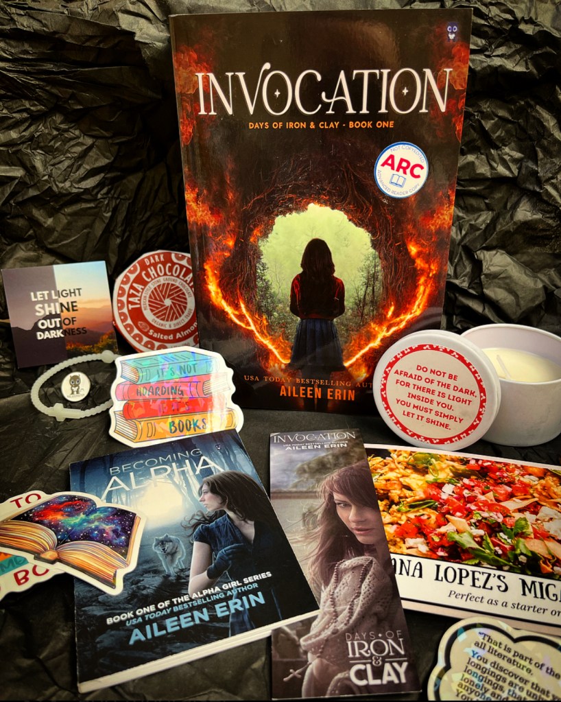 Happy Friday! I’m very excited to be sharing with you all about Aileen Erin’s latest series which kicks off with INVOCATION, the first book in the Days of Iron and Clay paranormal romance series! If you’ve read her Alpha Girl series then you’ll spot some familiar faces and if you haven’t, no worries! You don’t need to have read that series at all to enjoy this one but it’ll probably inspire you to! Okay okay let’s get back on task. Keep reading my post to find out more about the book and its author, a lil sneak peek, my review, and the awesome goodies that came in the promo box!